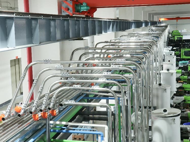 The Granules Centralized Feeding System is an integrated solution designed based on the layout of customer-site machines and their raw material consumption, combined with auxiliary equipment. It enables centralized feeding and control, achieving unmanned, continuous molding operations throughout the entire plant. Main system components include: Control Console, Cyclone Dust Collector, Filter, Blower, Branch Station, Drying Hopper, Dehumidifier, Material Selection Rack, Micro-feeding Hopper, Sight Hopper with Sensor, Air Shut-off Valve, and Material Shut-off Valve. The feeding volume can be flexibly adjusted according to the production capacity of different molding machines. This system enables uninterrupted, unmanned continuous molding operations. It allows for changing raw material types and the combination method of multi-color materials as needed, automating the coloring process. The system can achieve full automation via a monitoring console, automatically recycling and using sprue cold slug, controlling feeding equipment, and preventing blockages in storage silos.
